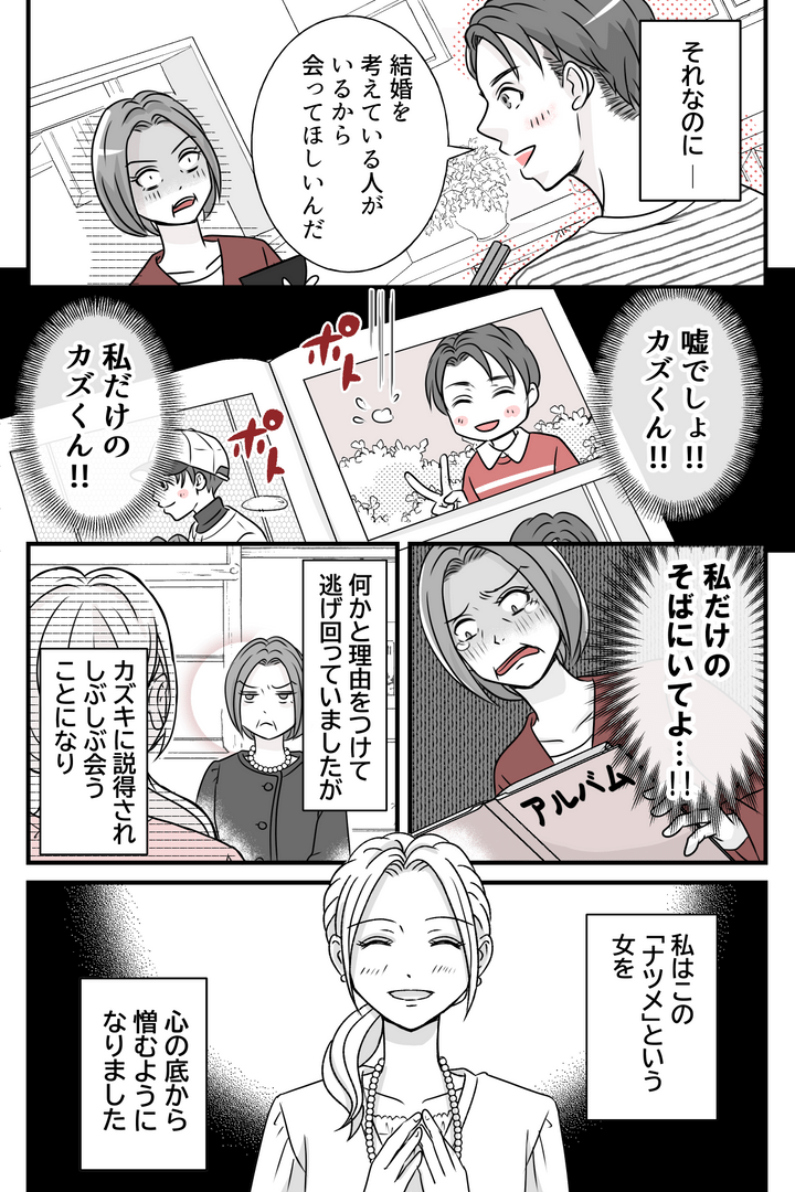 それから数年が経ち、カズキから「結婚を考えている人がいる」と告げられ、私は大きな衝撃を受けることに。私のカズキを奪おうとする「ナツメ」という女性のことを、心の底から憎むようになってしまいました。