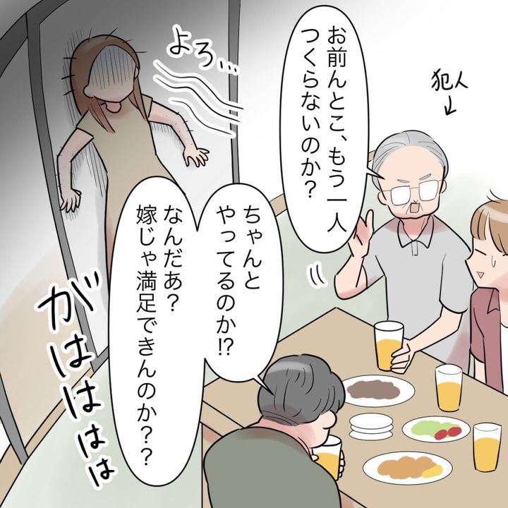 触ってくるなんてありえない・・・私はショックで壁によろけます。しかし撫でた本人は気にする様子もなく、「お前んとこ、もうひとりつくらないのか?」と呑気に質問します。ほかの親戚も「ちゃんとやってるのか!?なんだあ嫁じゃ満足できんのか?」とデリカシー皆無な発言。夫のミノルはと言うと、妻が触られたというのに苦笑いするだけです。