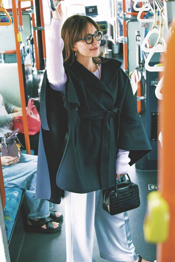 ケープコート¥99,000(エストネーション/エストネーション)ニット¥25,960(イウエン マトフ/ユナイテッドアローズ 渋谷スクランブルスクエア店)パンツ¥25,300(アンクレイヴ)バッグ¥82,500(メゾン カナウ/ヤマニ)メガネ¥49,500(モスコット/モスコット トウキョウ)ピアス¥47,300(リューク)ネックレス¥58,080(ペヨテ・バード・デザイン/ZUTTOHOLIC)