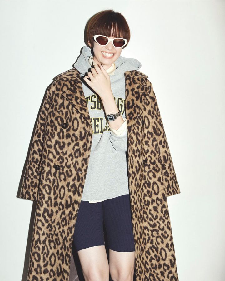 ロゴ入りのフーディを大人っぽく着るには? そう、レオパード柄の出番です。分かりやすくトレンドでもありますし、学生→大人の女性に変身できる手っ取り早い術。ボトムにサイクリングパンツを合わせるのも、今っぽくてよき。