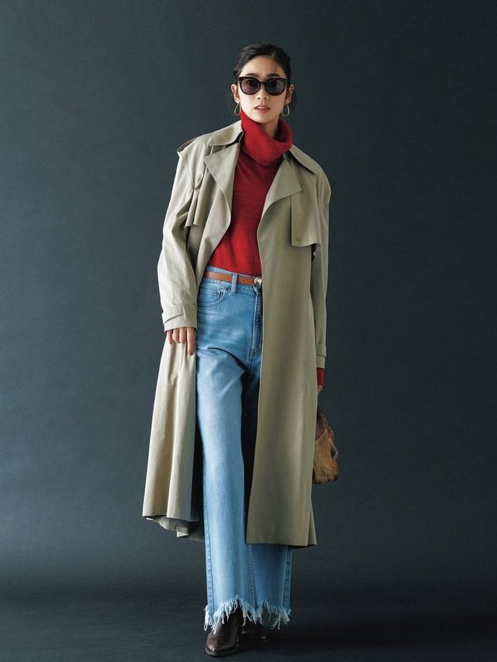 王道トレンチに赤のタートルを差せば、クラシックに今っぽい華やかさがひとさじ。鮮やかな赤が顔まわりを明るく照らし、タートル特有のボリューム感が顔立ちを引き立てて小顔効果も抜群。アップヘアで首元をすっきり見せつつ、細めのデニムで全体をシャープに整えれば、洗練された印象に仕上がります。