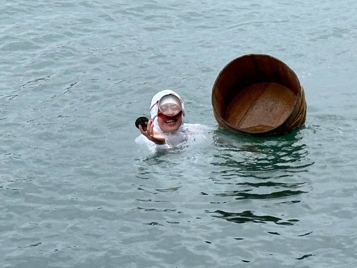 今は海女さんの人数もかなり少なくなり伊勢志摩エリアで600名程らしいのですが、思ったよりも多くて驚きました。それにしても海女さんの潜る姿が美しく、 シンクロナイズドスイミングの選手のようで感動しました。
