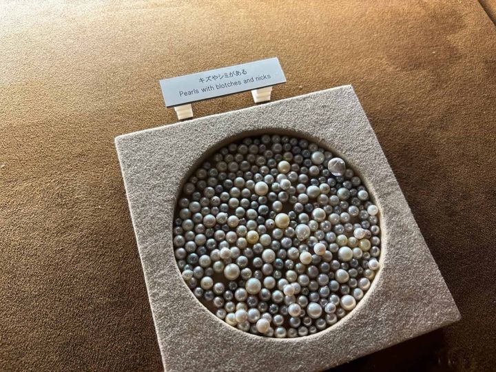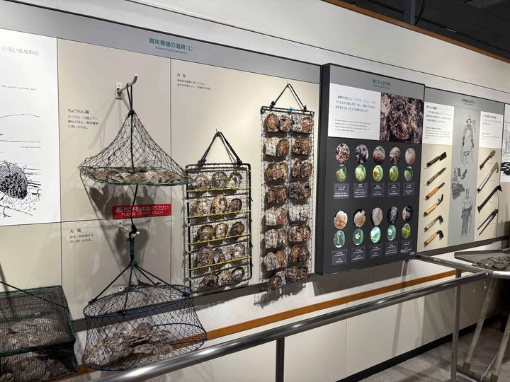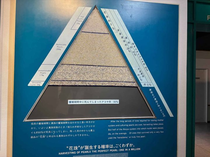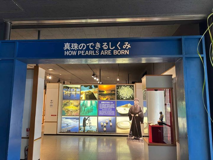 島内にある真珠博物館の1階は、真珠のできる仕組みや養殖方法など数多くの資料や映像とともに展示してあります。真珠を作る難しさや養殖場での作業など知らないことも多く、なんと核入れ手術を行ったアコヤガイの約50%が死貝になってしまうという事実! 更に良質の真珠は全体の約30%というから、長い時間をかけた養殖真珠の貴重性というのは分かりますね。