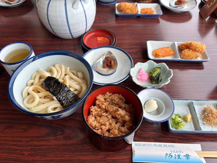 話は戻り、お昼は真珠島の中にあるレストラン「阿波幸」にて名物の伊勢うどんセットに舌鼓。「阿波幸」とは、創業者の御木本幸吉氏の生家であるうどん屋の店名を引き継いだレストランで、大きな窓から海を望んでゆったりとお食事が楽しめます。東京の人間からすると珍しいアコヤガイの貝柱を使った、干し貝柱や貝柱のフライなど味わえるのも嬉しい。生まれて初めて食べたアコヤガイの貝柱は味が濃くて身がしっかししていて美味でした! 伊勢でも冬にしか市場に出回らないアコヤガイの貝柱をここでは一年中食べられるそうですよ。伊勢うどんも、今まで私が食べた伊勢うどんの中で一番美味しかったです。