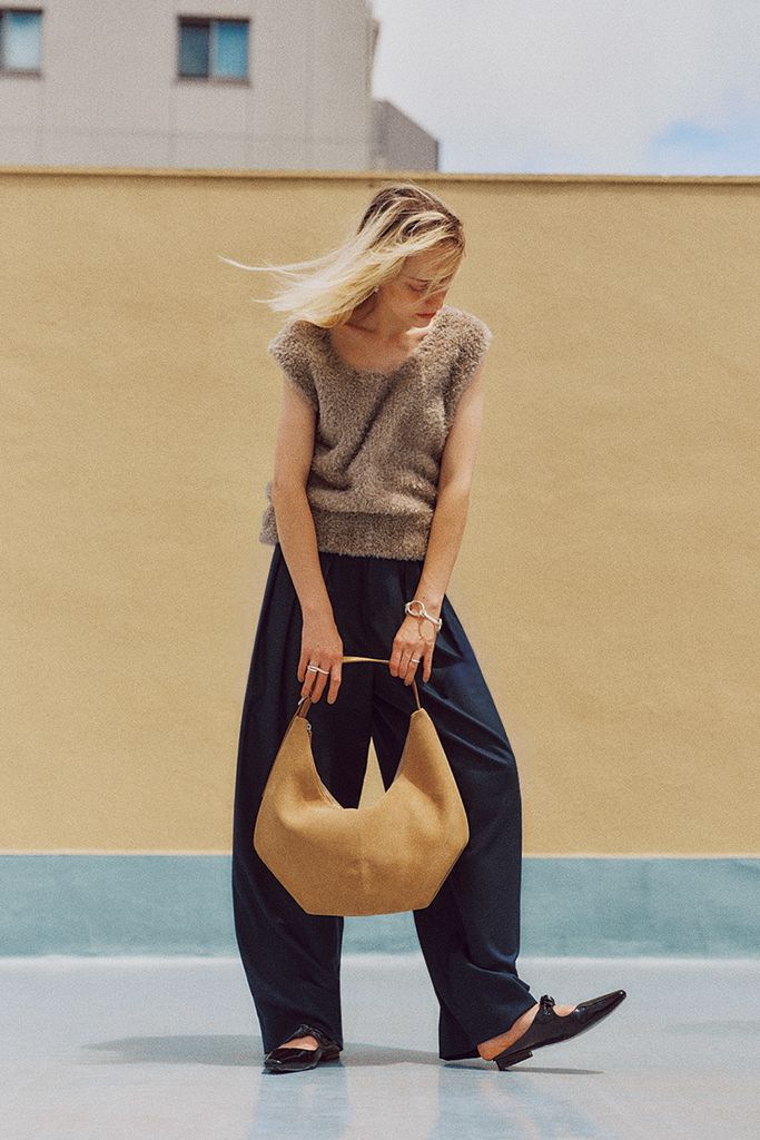 ルーズなワイドパンツを正統派なムードに導くベスト。ふわふわとした素材やツイード生地など、幅広ボトムと差がつきすぎずちぐはぐしにくい、重みのある質感からセレクト。ほどよく身ごろがあるぶん、薄手のカットソーやタートルなど長そでとのレイヤードもしやすいデザイン。