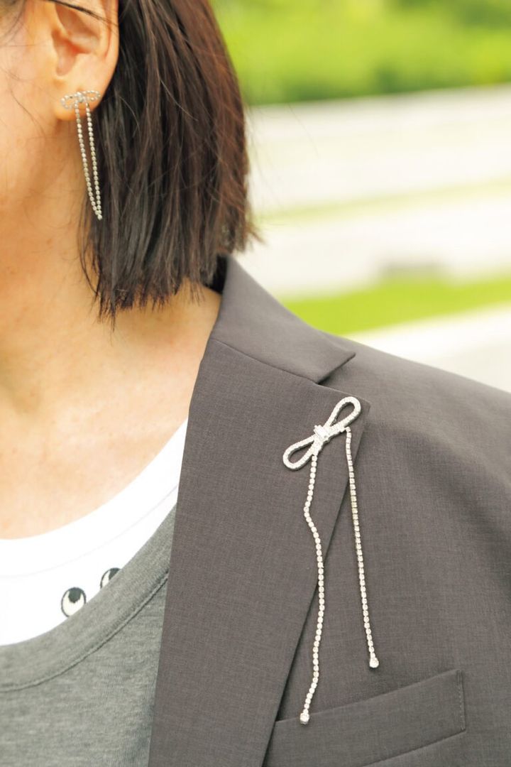 「イヤリングとブローチは、あえてちょっぴり甘めなリボンモチーフにして甘辛ミックスに。顔まわりをぐっと華やかにしてくれます」