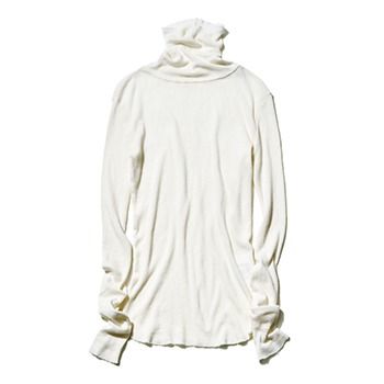 1枚でも着やすいほどよい透け感、肌あたり良好なカシミヤ混。首元がくしゅっとたゆみ、顔まわりに抜けをマーク。黒タートルほどのストイックさはなく、肌になじんで柔和に着地。 白タートルカットソー/ソージュ(ソージュ オンラインストア)