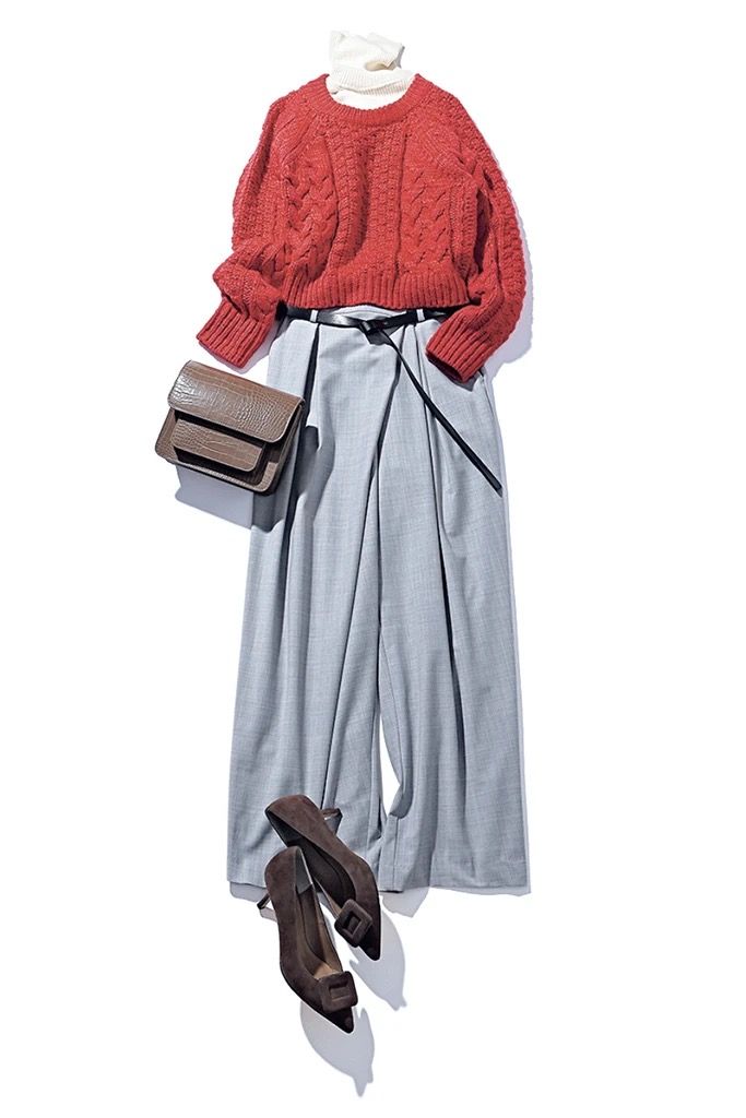 白のタートルで首元にやわらかなニュアンスを与えたら、目を引く赤も使いやすく。グレーと同じくあいまいなブラウン小物で仕上げて、赤以外はマイルドなトーンを意識。
