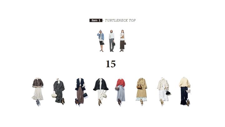 抜けと引き締め、やわらかさと緊張感など、スタイリングに欲しい多くの要素を1つで担う白タートル。着回し「ながら」新しい服の投入、ベーシックなアイテムだけで「着方を変えて」見違える着こなし方など、その実力を実証。