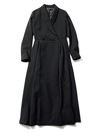 カシュクールワンピース/TSURU By MARIKO OIKAWA 「潔く上品に着たい、アウター並みに重厚感のある風合いで、1枚で着るのはもちろんのこと、アウターとしても大いに活躍。すそまでボタンがついていて、前開きでも安心です」(岩田さん)
