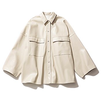 オフ白レザーシャツジャケット/HER. 「これから先、羽織りとしても重宝する厚みのあるオーバーサイズ。レザーに苦手意識がある人も、白シャツのような感覚ならとり入れやすいと思います。真っ白ではなくベージュに近いクリーミイな色で合わせやすい」(樋口さん)