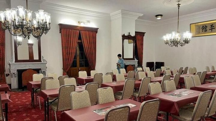 会場は豊平館の2階。大広間でお客様をお出迎え。こちらは普段、昼間は有料で見学ができるのですが、夜の姿はとってもレア。