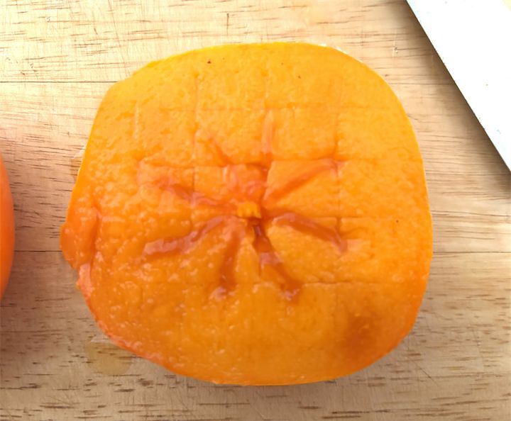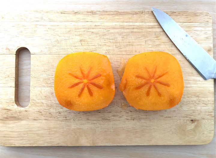 1. 柿はよく洗って水気を拭き取り、皮のまま横半分に切る。切った断面に格子状の切り込みを入れておく。