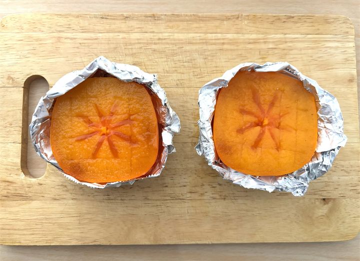 柿を切って、アルミホイルに包んで、グリルに入れて焼くだけの簡単スイーツ!
