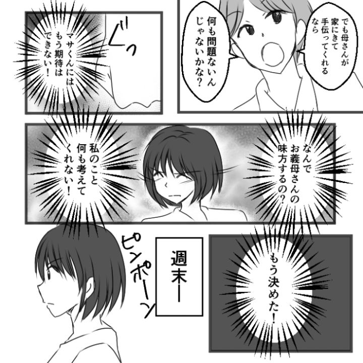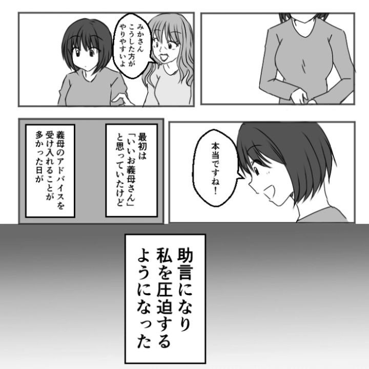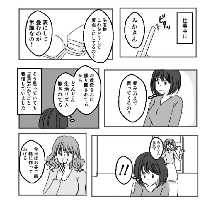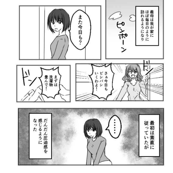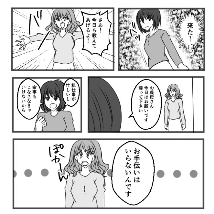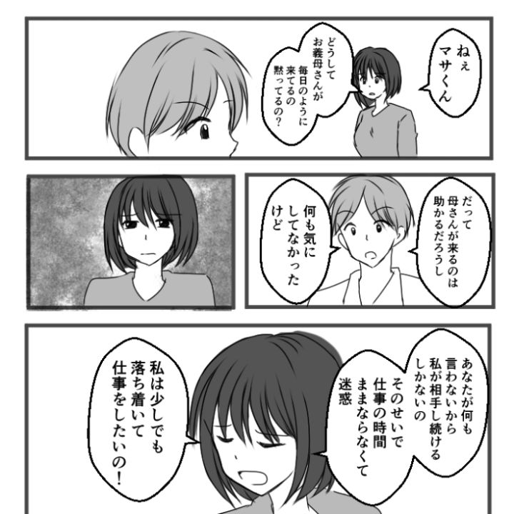 主人公は結婚して半年。義母は毎日のようにやってきて主人公の在宅仕事を邪魔するかのように家事にダメ出しをしてくるようで・・・。