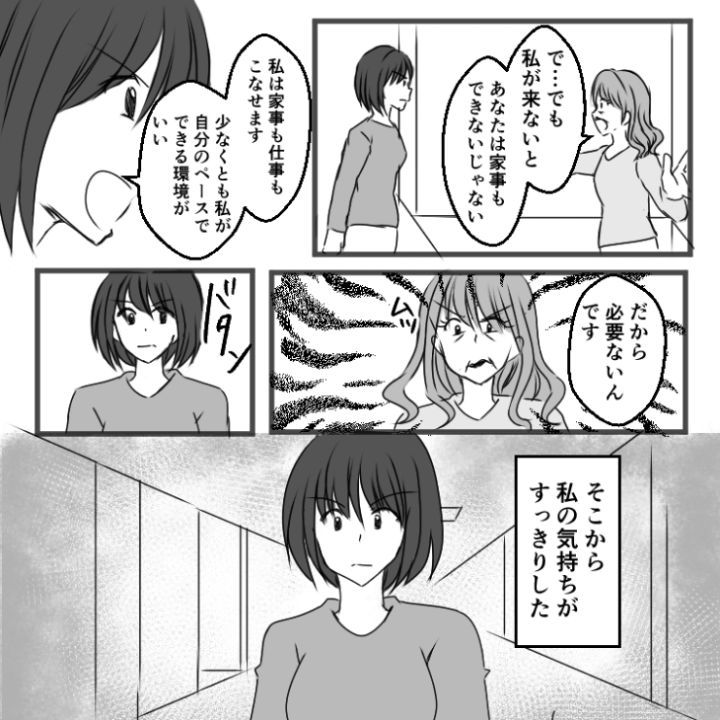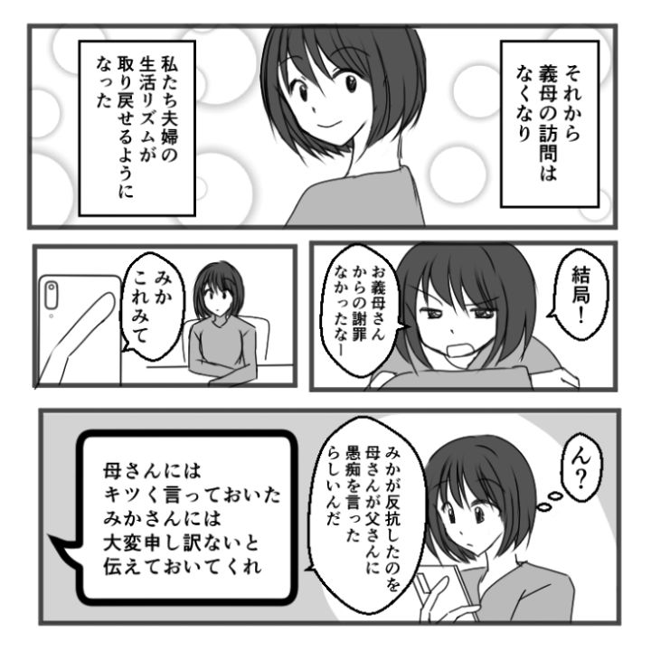 自分の気持ちを夫、義母に伝えたことで日々の平和が戻った主人公。思っていることを伝える大切さを実感した出来事だったようです。