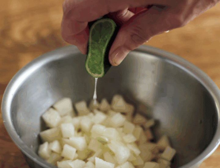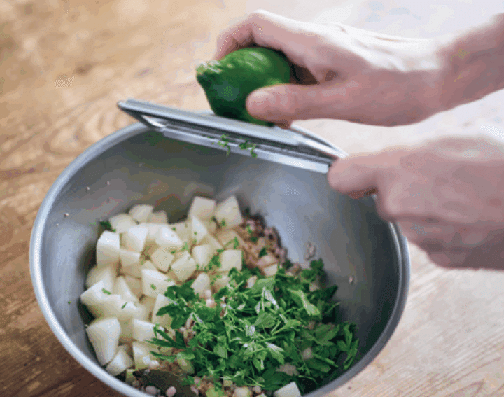 ライムの皮をすりおろしながら加えて香りづけを。レモンを使ってもOK。