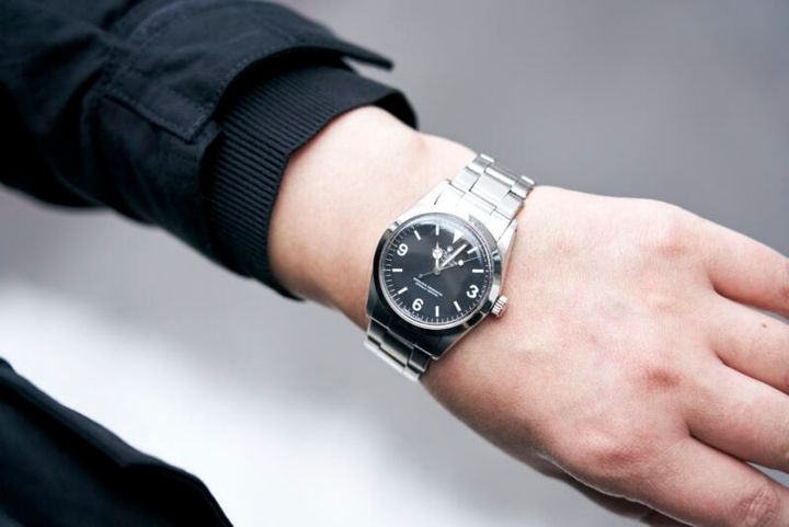 黒文字盤のヴィンテージロレックスはメンズ。「私たち夫婦は大阪と東京の二拠点で暮らしていて、夫から『これ、持っといて』と愛用の時計を手渡されました」と森さん。アウターやバッグ、シューズと、小物を黒で統一したカラーコーデがおしゃれです。