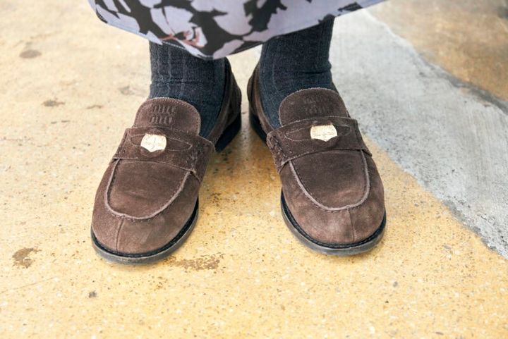 ボッテガ・ヴェネタのシグネチャーデザインのローファーは、ダンスシューズにインスパイアされたもの。鮮やかなロングスカートをメンズライクなローファーで引き締めました。「カジュアルなデザインのコートジャケットに、このローファーを合わせると、商談の席にも自信をもってのぞめます」(森さん)