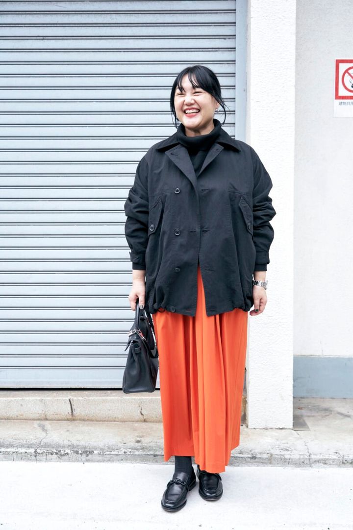 「このハンティングジャケットは、ヒップが隠れる丈感でロングスカートとの相性もいいんです」と森さん。落ちついたオレンジのスカートには、「内側にランダムなタックが入っていて、広がりすぎないから、タテのラインがつくれます」(森さん)。ワッフル編みのタートルネックセーターで抜け感を出して、ロングスカートでスタイルアップしました。