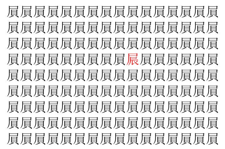 画像の中には、「屓」という漢字が縦に9行、横に16個並んでいます。 全部で144個となりますが・・・、そのうち1つは「異なる漢字」となってますよ!!