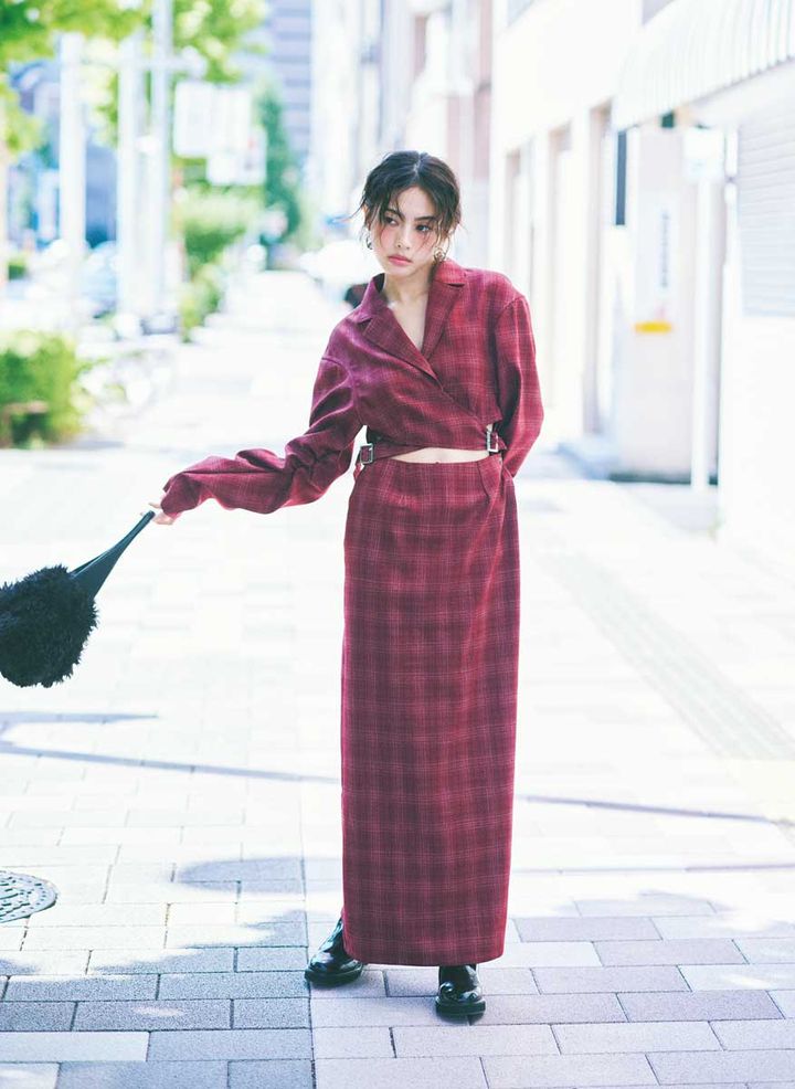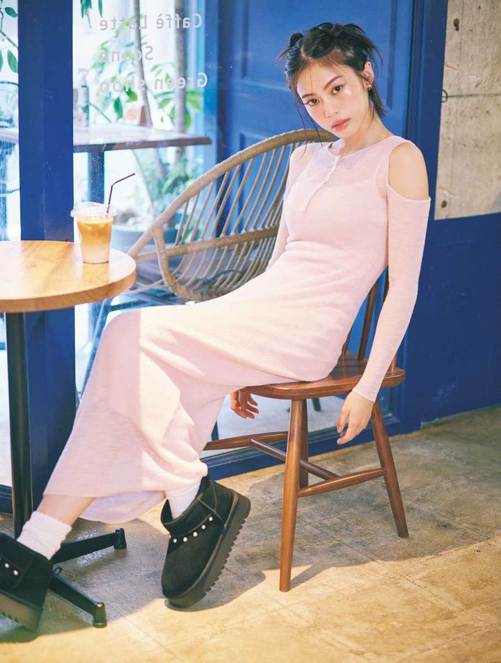 安斉星来。ar11月号より ワンピース¥27,500/アメリ(アメリヴィンテージ) ピアス¥7,800/トゥワクリム(ハチマルゴショールー ム) バッグ¥19,800/シャポード オー(シャポー ド オー 東急プラザ銀座店) ブーツ¥15,950/ランダ