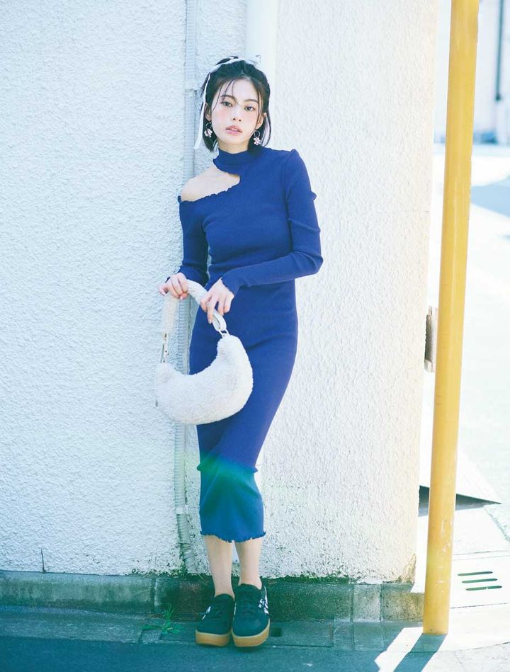安斉星来。ar11月号より ワンピース¥28,600/オペラスポーツ(エンメ) ピアス¥3,960/マチルダローズ(ハチマルゴショールーム) バッグ¥11,000/アルテミス by ダイアナ(アルテミス by ダイアナ アーバンドック ららぽーと豊洲店) スニーカー¥15,400/プーマ(プーマ お客様サービス) リボン/スタイリスト私物