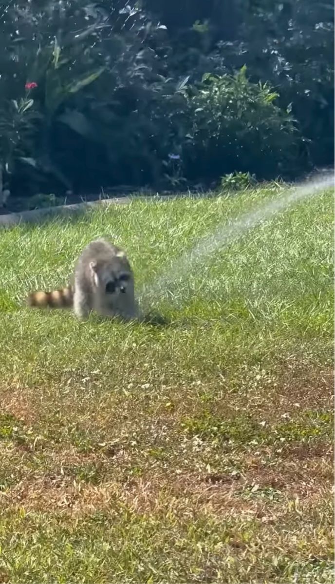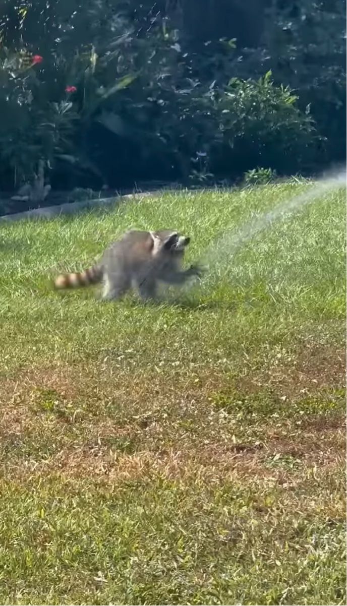バケツに入った水をホースで撒く男性。 その先には、無邪気に水遊びを楽しむアライグマの姿がありました!