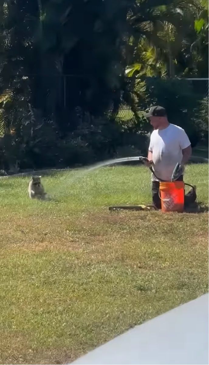 お客さんの家で仕事をしていたこちらの男性。 なにやらバケツの水をホースで撒いていると思いきや・・・、そばにいたアライグマに水をかけてあげていたんです!