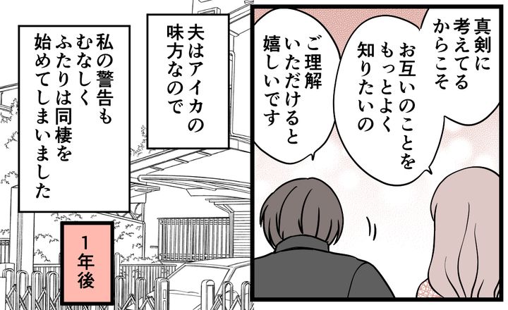 私はまだ腑に落ちませんでしたが、夫がアイカの味方になってしまい……それ以上は何も言えませんでした。こうして私の忠告も虚しく、若いふたりは同棲することになったのでした。そして、アイカが同棲を始めて1年が経ちました。