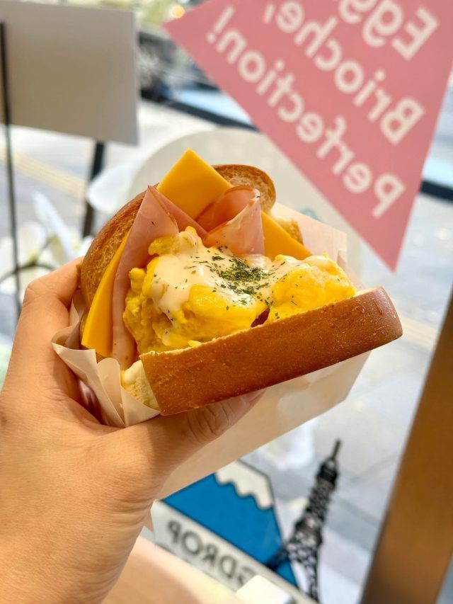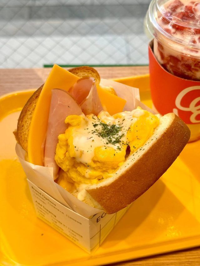 サンドイッチは、食パンも卵もふんわり。 柔らかいブリオッシュ生地の食パンに、できたてのスクランブルエッグとハム、チーズ、ソースが挟まれて、パクリとすごく食べるとおいしい! これは人気になるのもわかります。 パッケージもオシャレですよね。