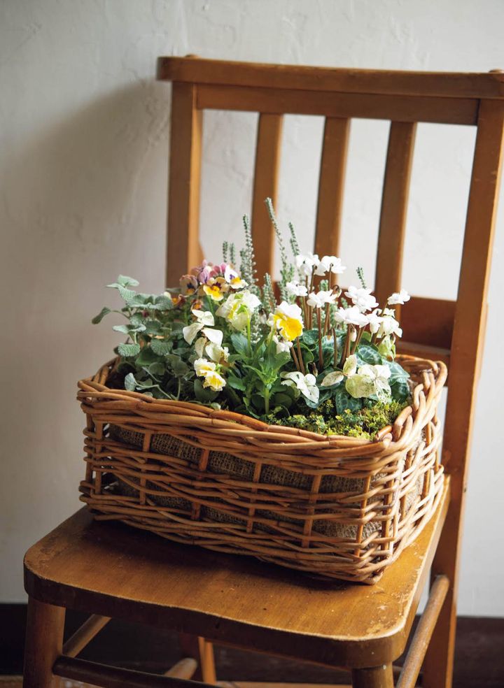 白花のガーデンシクラメン ‘フェアリーピコポーラー’ と、やさしい黄色が印象的なビオラ ‘エッグタルト’ を中心に、やわらかな彩りの草花を合わせました。アラログ素材のバスケットに植え込むことで、素朴であたたかみのある雰囲気を大切に。葉の質感や色合いに変化をつけ、秋を楽しめそうな寄せ植えができあがりました。