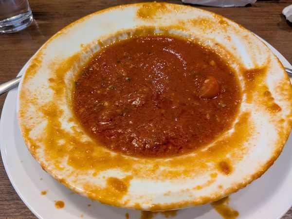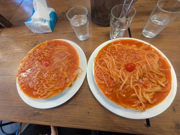 下のお皿にまでこぼれ落ちるトマトスープに、皿一杯のパスタ。