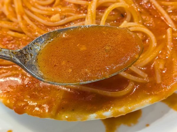 しっかりソースと絡めてパスタを食べても、こんなにもソースが残っていました。