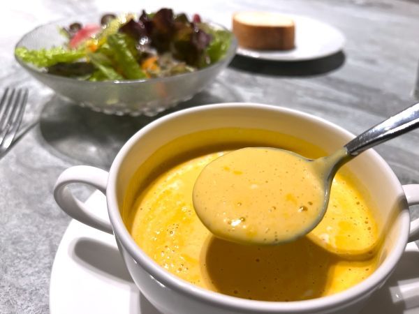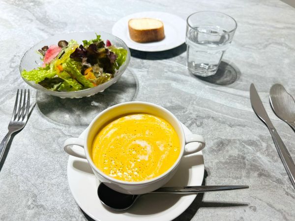 運ばれてきたスープは、「にんじんスープ」。 ふわっとした滑らかさと、初めて味わった生クリームのコクのすごさ。 一口目から「このスープを味わえただけで、もう満足」と、お店に入った自分を褒めました(笑)。