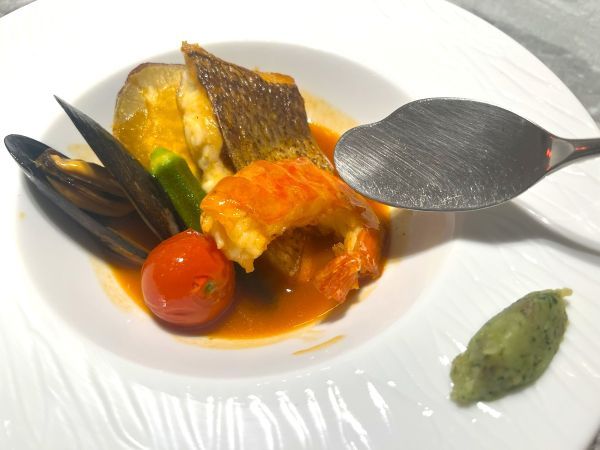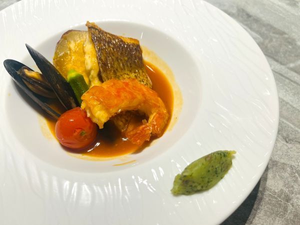 次に運ばれてきた、メインの「真鯛と魚介のブイヤベース」。 パリッと焼かれた皮の鯛をはじめ、一つ一つの食材の火の通りがとにかく絶妙で、初めてのブイヤベースを一人感激しながら味わいました。