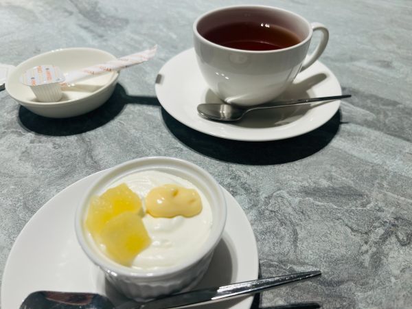 最後に、この日のミニデザート「ヨーグルトムース」。 好みのムース感で、リンゴのコンポートもしゃきっと感が残る美味しさ。カスタードのようなものは、サバイヨンソースといわれるもので、日頃口にできない味にも出会え、幸せな気分で食事を終えました。