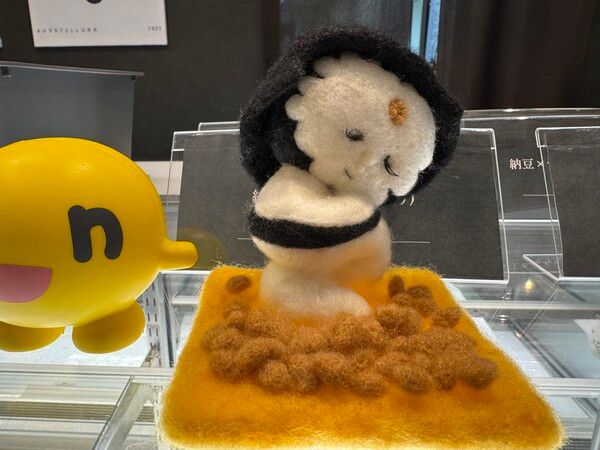 お店に入ると、細巻き風のライトを持ったお猿さんの置物が出迎えてくれます。後ろのポスターは、遠回しに納豆の「ネバネバ」をイメージできるようにしているとのこと。じっと見ていると、不思議と本当にネバネバに見えてくるから驚きです。