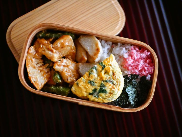 追記:分かりにくいけど、長芋の残りをナンプラーで炒めて、ツレの弁当のおかずに。左は鶏とたけのことアスパラの味噌炒め、真ん中が三つ葉入り玉子焼きで、その上が長芋炒め。仕事で使った桜でんぶをはじにちょっと詰める。下は海苔。
