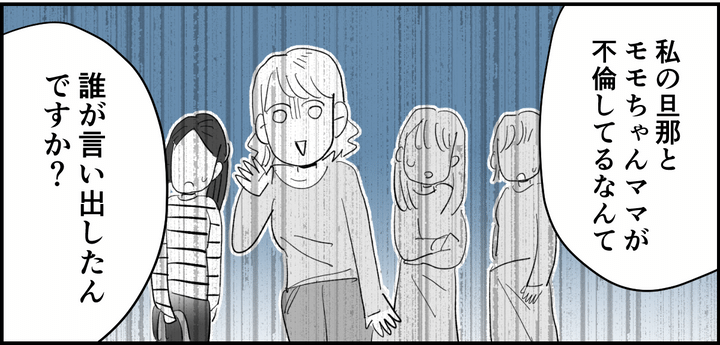 私は、ユウコちゃんと一緒にママ友の輪に挨拶。そして、リリカは私を見つけると嬉しそうに駆け寄ってきて話しかけてきました。しかし「私の旦那とユウコちゃんが不倫をしているなんてウワサを流しているのは誰ですか?」と、私がいうと、一瞬でその場の空気が変わったのがわかりました。
