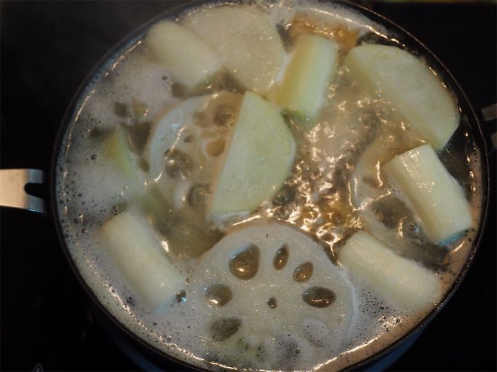 1. 鍋に水1.5L(分量外)と手羽先を入れて中火で熱し、沸騰したらアクを取り15分ほど煮る。