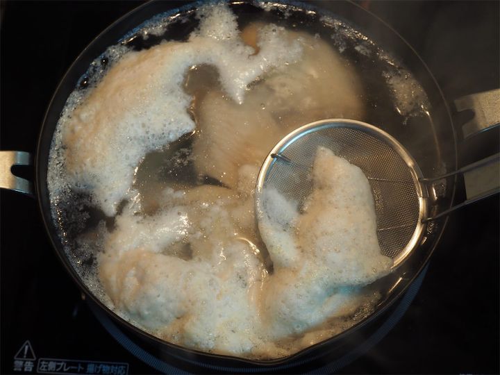 レシピを確認していく前に、今回の挑戦で学んだ、ためになるティップスを紹介します。それは「アク取り」。アク取りといえばわたしはいつも、グツグツ煮込んでアクが出てきたら取り除くという作業を繰り返していました。しかし、志麻さんによると沸き始めにいちばんアクが出るため、一度沸騰させてから火を弱めると、アクが一気に出てきて一度でまとめて取ることが出来るそう。し、知らなかった!実際にやってみると、食材が手羽先だけということもあり、気持ちいいほど簡単にアクが取れて感動しました。みなさんも楽しんでアク取りをしてみてください。