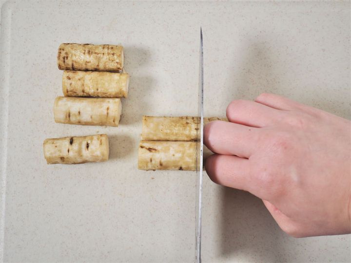 4. ごぼうの皮を軽くこそぎ落とし、5cm幅に切る。