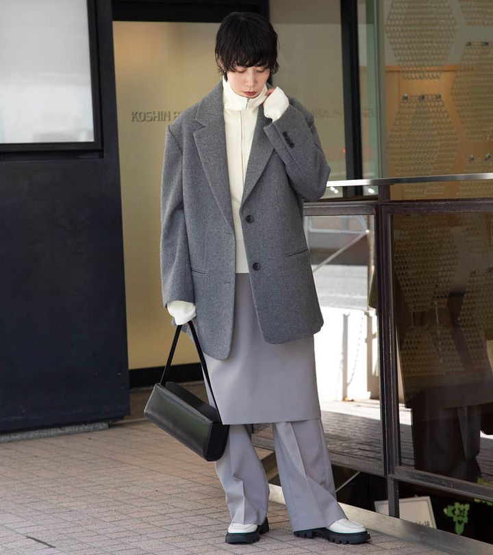ジャコート¥63,800、ニット¥24,200(共にガリャルダガランテ)、ローファー¥24,200(2.718/全てガリャルダガランテ 青山店)、ガリャルダガランテのレイヤードパンツ、セントアグニのバッグは本人私物
