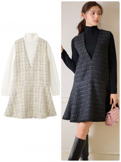 ツイード生地を使用したジャンパースカートとニットトップスのセットアイテム。ジャンスカの衿ぐりは深いシャープなVネックで顔まわりすっきり。腰下から切り替えたフレアースカートは、スタイルアップにもお役立ち。