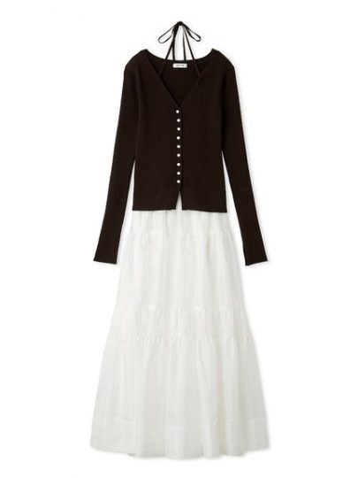 並んだパールボタンが華やかなリブカーディガンと、空気をはらむようなボリュームティアードスカートがセットになったセパレートアイテム。広めに開いたVネックには、ホルターストラップをあしらってデコルテを美しく演出。スカートのバックウエストはゴム仕様のため、たっぷりのギャザーがふわりと揺れ、きれいな余韻を作ります。
