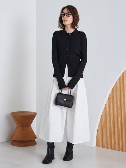 ホリデーシーズンにぴったりなバイカラーカーディガンとフレアスカートのセットアップ。バイカラーがクラシカルな雰囲気を演出し、金ボタンが華やかで高級感のある一枚です。ニットスカートは目の詰まった総針で編み立て、立体感のあるフレアシルエットがデザインポイントになっています。