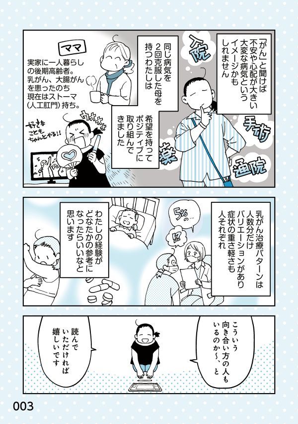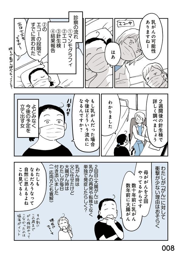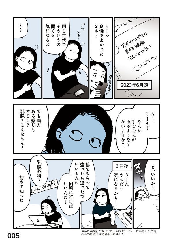 「体力はそこそこあるし」健康診断をおろそかにしていた漫画家が、ある日胸のしこりに気付き…5%の希少乳がんになり、自分なりの向き合い方を描いた乳がん治療体験コミックエッセイ。