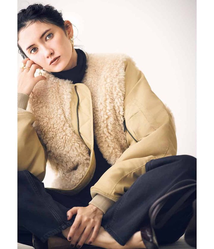 「ベージュのショート丈アウターは、合わせを選ばず、万能に頼れる」と市川さんも太鼓判。着映えと着回し力を備えたブルゾンは、論理学者の合理的思考にフィット。