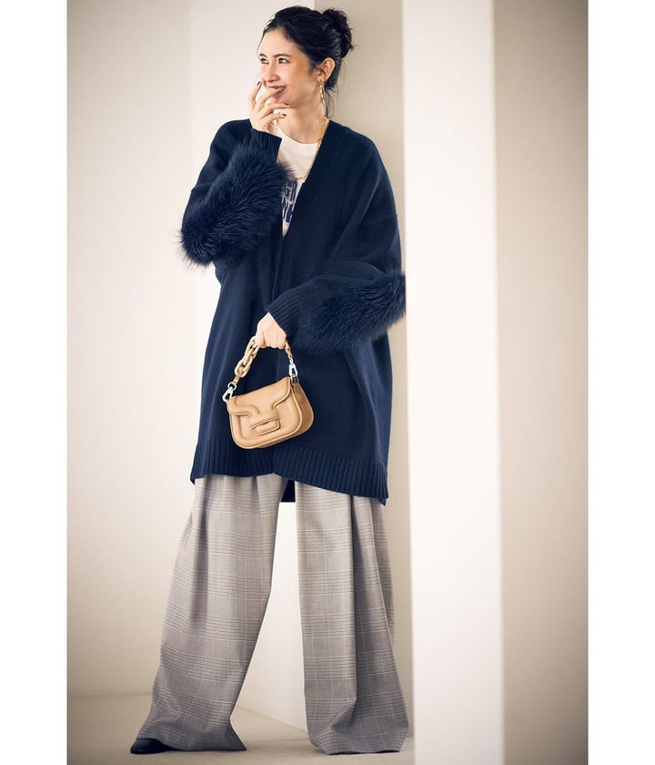 存在感がありながら上品な、ファーMIXのロングカーデ。ロゴT合わせも、ゆる×ゆるのコンビもキレイめにまとめる名アイテム。